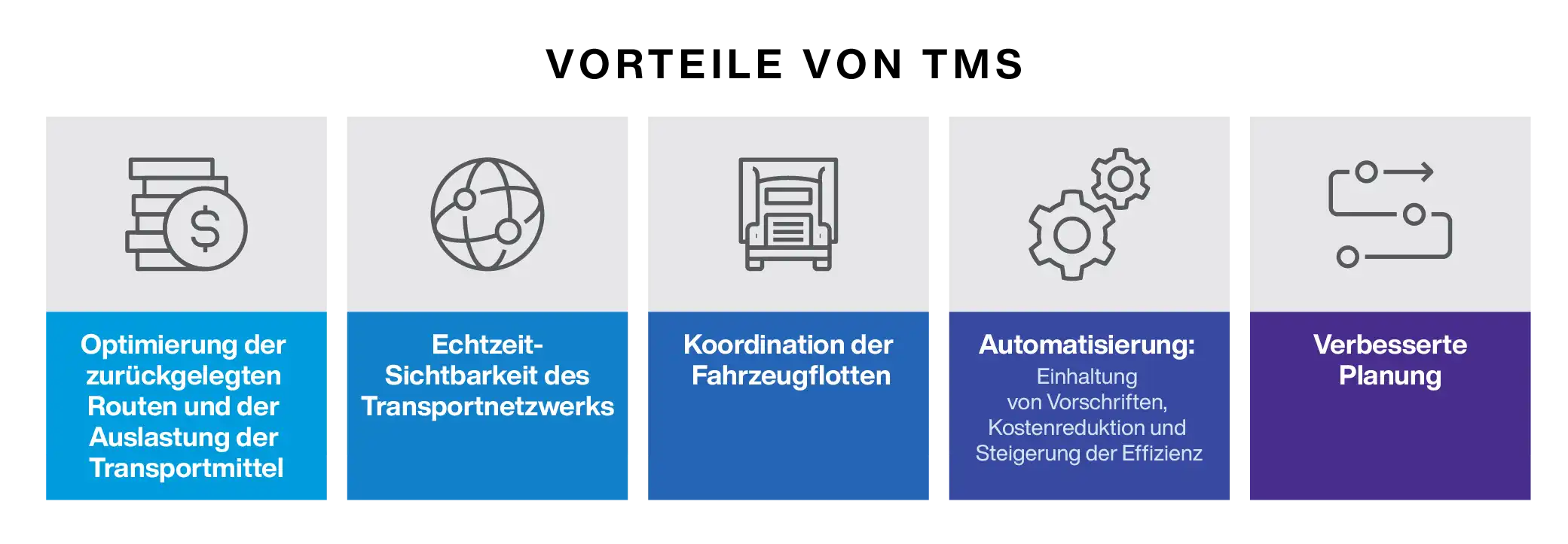 Zu den wichtigsten Vorteilen eines TMS zählen: die Optimierung von gefahrenen Routen und Frachtkapazitäten, Echtzeit-Transparenz über das gesamte Transportnetzwerk, eine koordinierte Flottensteuerung durch ausgewogene Ressourcenzuweisung, automatisierte Prozesse zur Einhaltung gesetzlicher Vorgaben, Kostenreduzierung, Effizienzsteigerung sowie eine verbesserte Transportplanung.