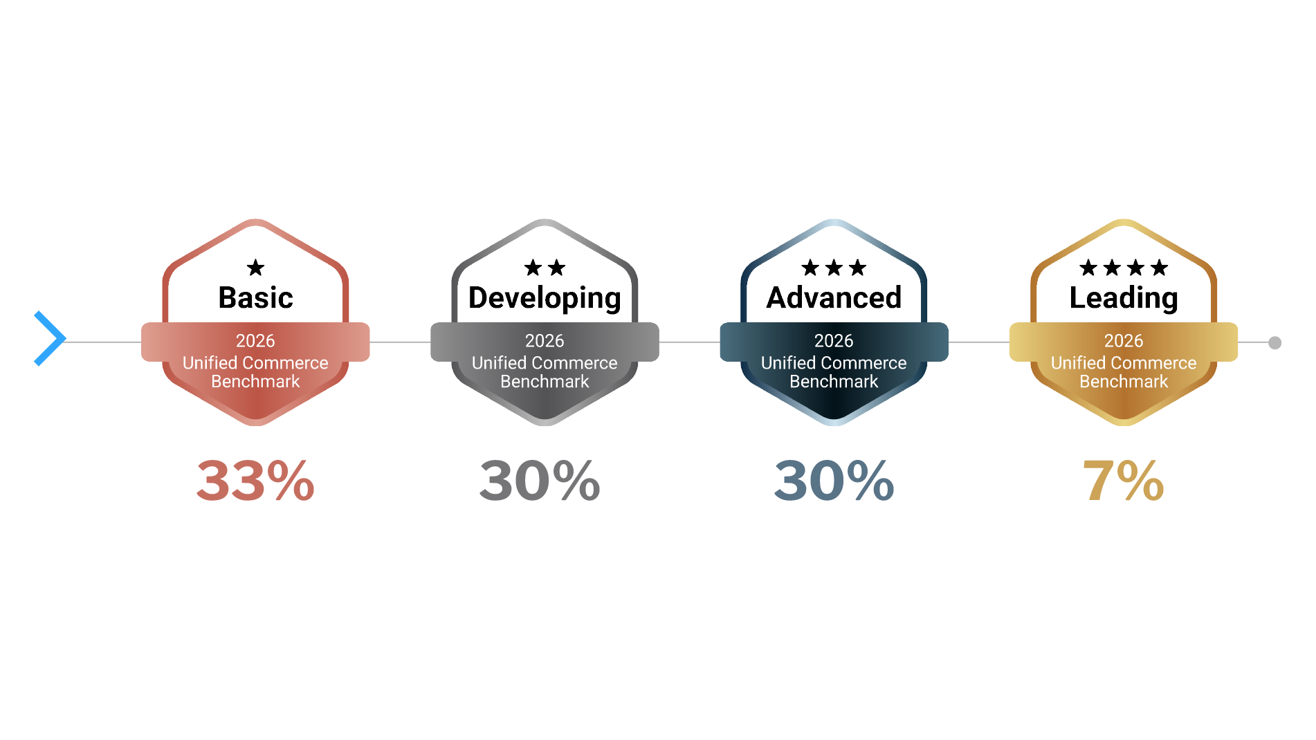 The distribution of maturity levels highlights the challenge: 33% operate at the Basic stage, with 30% each at Developing and Advanced tiers. Just 7% have attained Leading status. This gap creates a significant competitive advantage for those who master unified commerce; transforming strategy and experience into ongoing growth, resilience, and financial success.