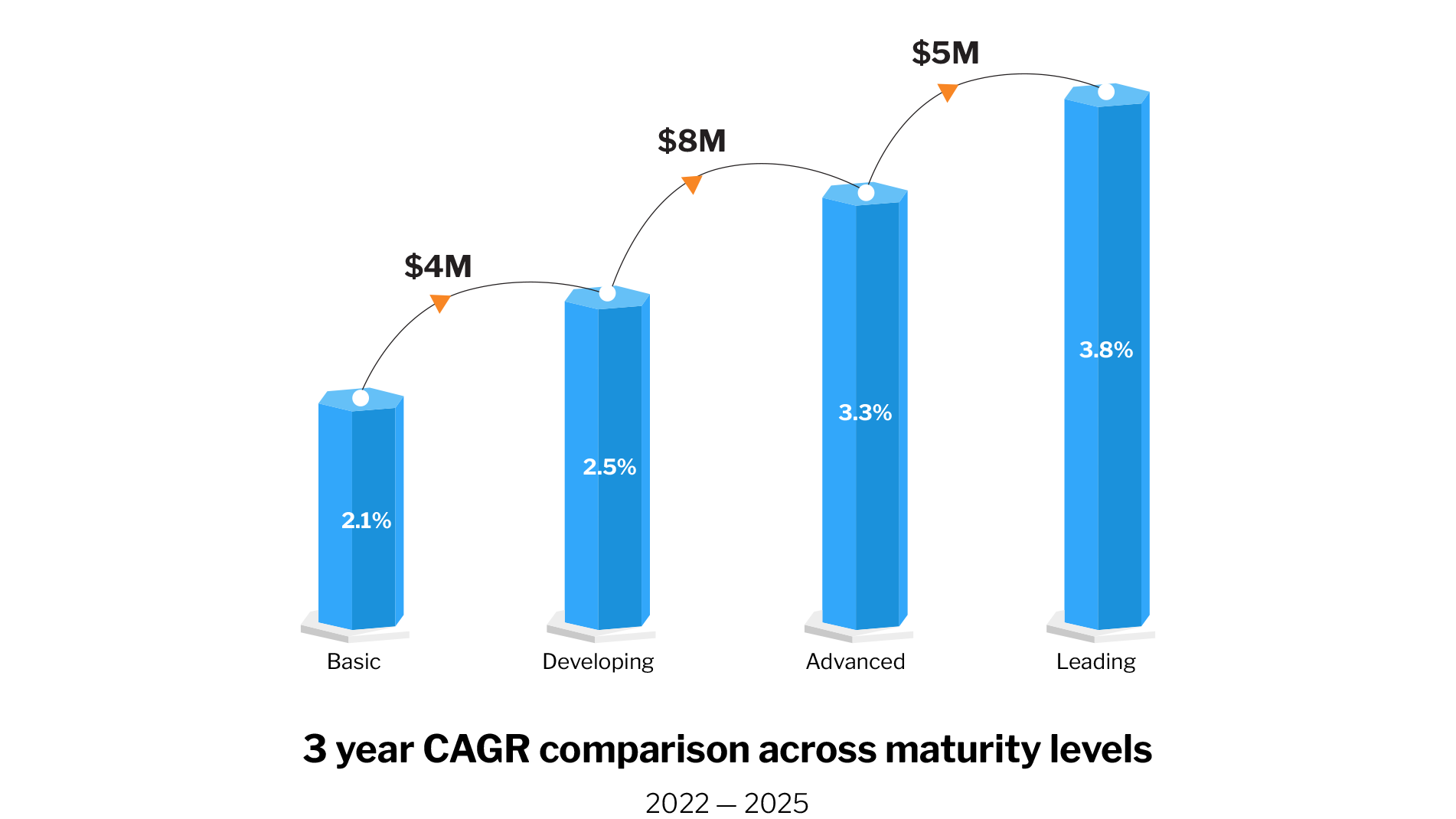 Retailers at the Basic level see a growth rate of 2.1% CAGR, adding $4 million in incremental revenue for every billion dollars. Pacesetters at the Leading maturity level outperform with a 3.8% CAGR and $17 million in additional revenue, highlighting the immense growth potential from Basic to Leading. Transitioning from Developing to Advanced maturity levels delivers the most significant near-term revenue boost, underscoring the importance of investing in operational excellence and customer experience. As these growth benefits accumulate over time, the opportunities for expansion become even more promising.